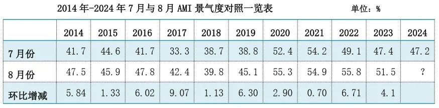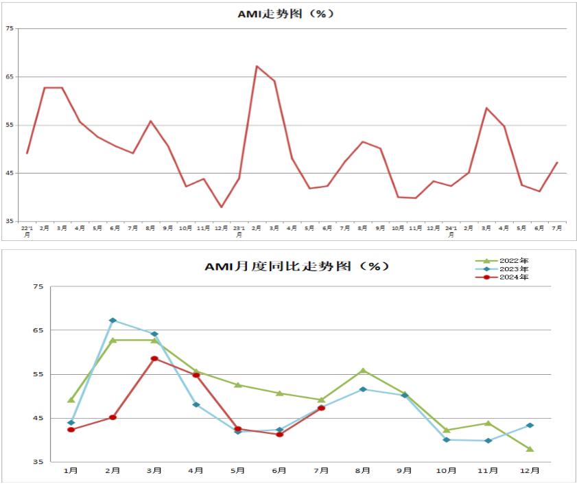 特约分析师张华光认为:正如我们上月的预测,7月份AMI环比上涨,同比基本与去年持平,景气度有所回升,以47.2%的景气度仍滞留于不景气区间。AMI环比在经历了连续三个月下滑后,景气度有所反弹,虽仍处于近三年同期的历史低位,但降幅收窄,同比基本与去年持平。7月份AMI的走势与去年基本一致,自7月份开始,市场开始有启动迹象,并开启下半年淡旺季转换的新阶段。