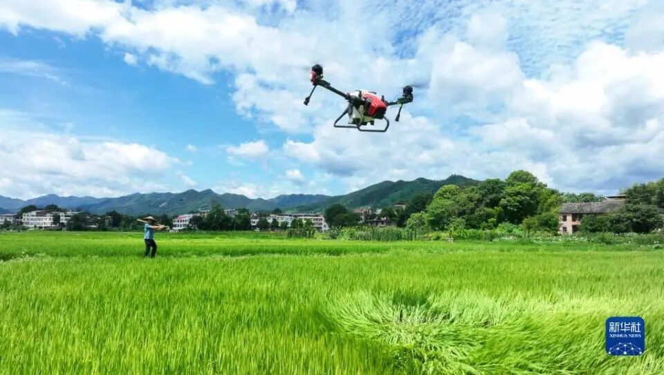 图为工作人员在湖南省益阳市赫山区米香村的稻田旁操控无人机给晚稻打药。新华社记者 薛宇舸 摄在益阳市赫山区、桃江县等地区,植保无人机搭载多光谱摄像头和导航系统能够自主飞行拍摄,监测农作物健康状况,并自动生成施药方案,实现查打一体化精准防治。无人机作业不仅提高了施药的精准度,还减少了农药的浪费,使农药更均匀地覆盖农作物,有力地保护了农业生态环境。常德市鼎城区通过无人机飞防演示,展现了无人机对农田管理精准防控中的潜力和无人机在提高作业效率、减少农药使用量、保护农业生态环境方面的优势,为农产品质量和农业生态环境安全提供了有效保障。下阶段,无人机也将继续发挥其作用,抓好水稻重大病虫防控,确保实现“虫口夺粮”保丰收。