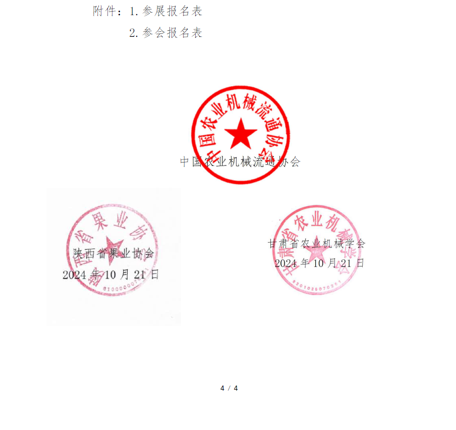 农机地头展——陕甘地区果园生产全程机械化智能化专题演示展示暨苹果生产新技术观摩活动现场地址:长武县高值高效苹果示范园、陕西庆丰源生态农业开发有限责任公司路家基地(长武县亭口镇胡堡村)1.农机产品:包括建园、育苗、嫁接、耕整、捡石、栽植、开沟、施肥、割草、植保、修剪、碎枝、收获、搬运、堆肥、初加工、包装等机械,动力机械、水肥一体化设备、防灾减灾设施设备、农用航空器、智能农机产品、农业物联网设备等。2.农资产品:苗木、肥料、农药、农膜、立柱、果筐、网套、防鸟 (雹、虫、风) 网、遮雨棚、包装箱等,其他。不收取费用。企业产品运输及人员食宿费用自理。请于11月5日下午4点前将机具运输到指定地点并完成调试准备工作。活动免费提供叉车、吊车装卸等服务。参展报名表详见附件1。不收取费用。邀请陕西、甘肃及西北地区有关果业、农机方面管理部门、推广单位、科研院所,农机生产企业、农机流通企业、农机使用群体,农资群体,果业公司、种植大户、果农群体,农业社会化服务组织等参加活动。外地需要住宿、摆渡的人员,请填写参会报名表(详见附件2),住宿统一安排,费用自理,大会提供工作简餐。其他人员自行前往,无需报名。务请遵守现场工作人员安排,注意安全。酒店信息:金宏国际酒店(长武县昭仁大街与北大街交叉口东南角),房间价格:标准间、大床间含早餐均为228元/间。1.季节(中国农业机械流通协会),手机号码:15001215914。2.高珊(河北保东农业机械有限公司),手机号码:18031147539。3.报名邮箱:camda666@126.com,报名截止到10月31日中午12点。